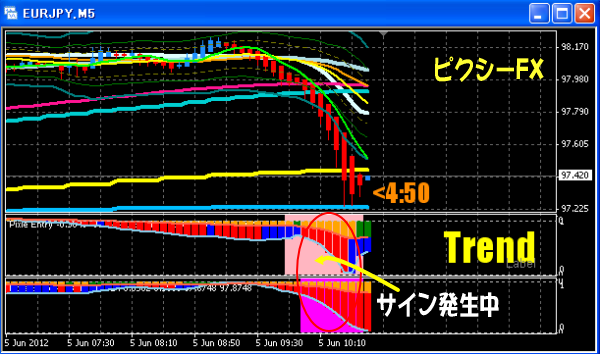 5分足でゲジゲジとツチノコが赤くなり、下落トレンドになっています。