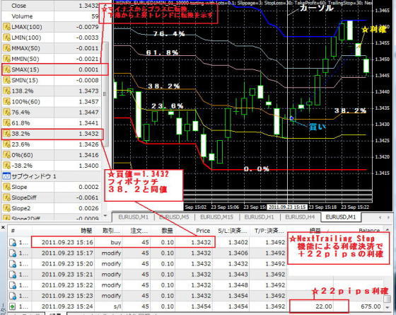 小さめ目のトレンドを狙い、数十pips取りに行くシステムです。